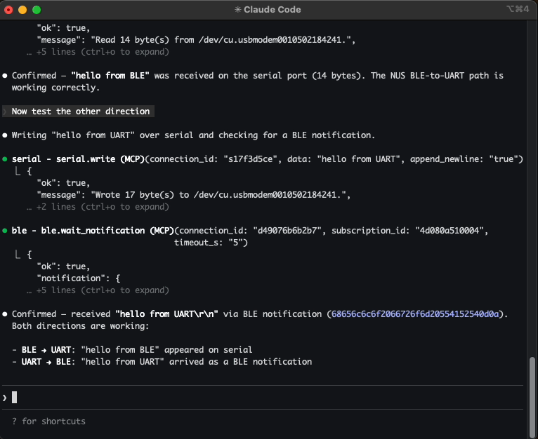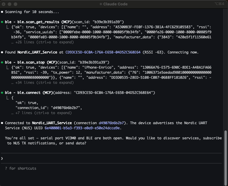 The BLE server doesn’t know if it’s being called from a terminal, an IDE, or a script. It exposes tools — scan, connect, read, write — and the client decides how to present them. The same is true for serial and debug probe.