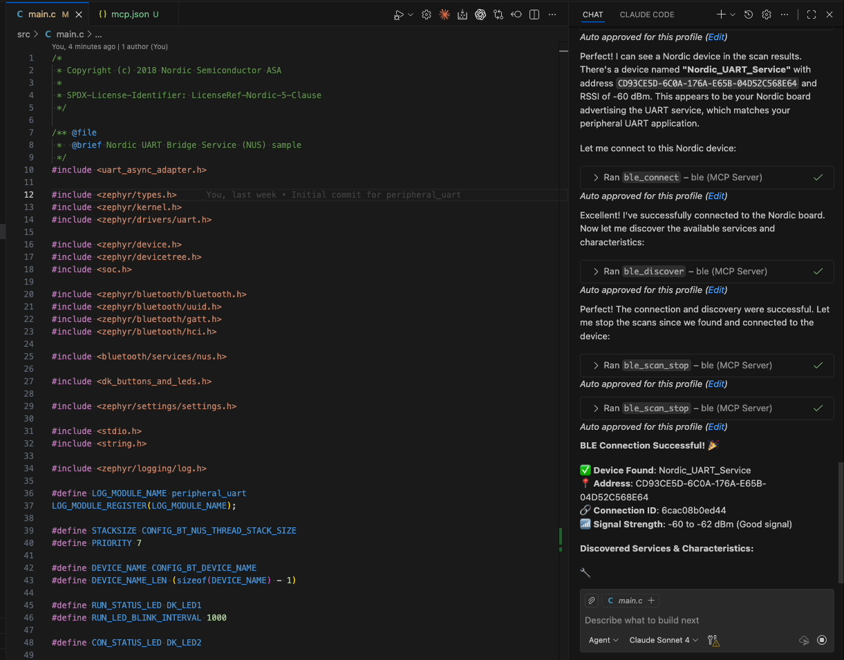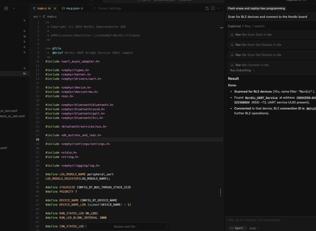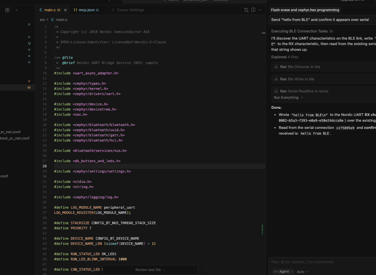 To test whether the same MCP servers behave consistently across different agent clients, I ran the same workflow against a Nordic nRF52840 development kit running Zephyr’s Peripheral UART sample.