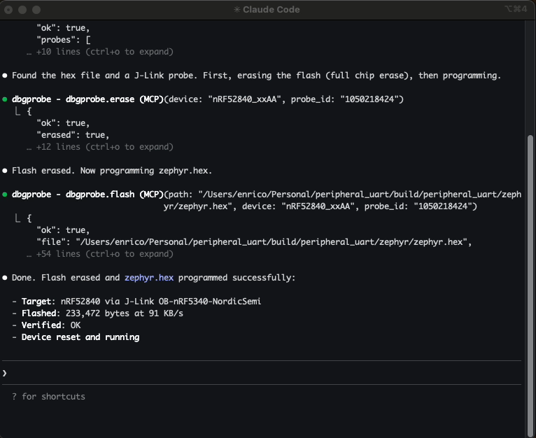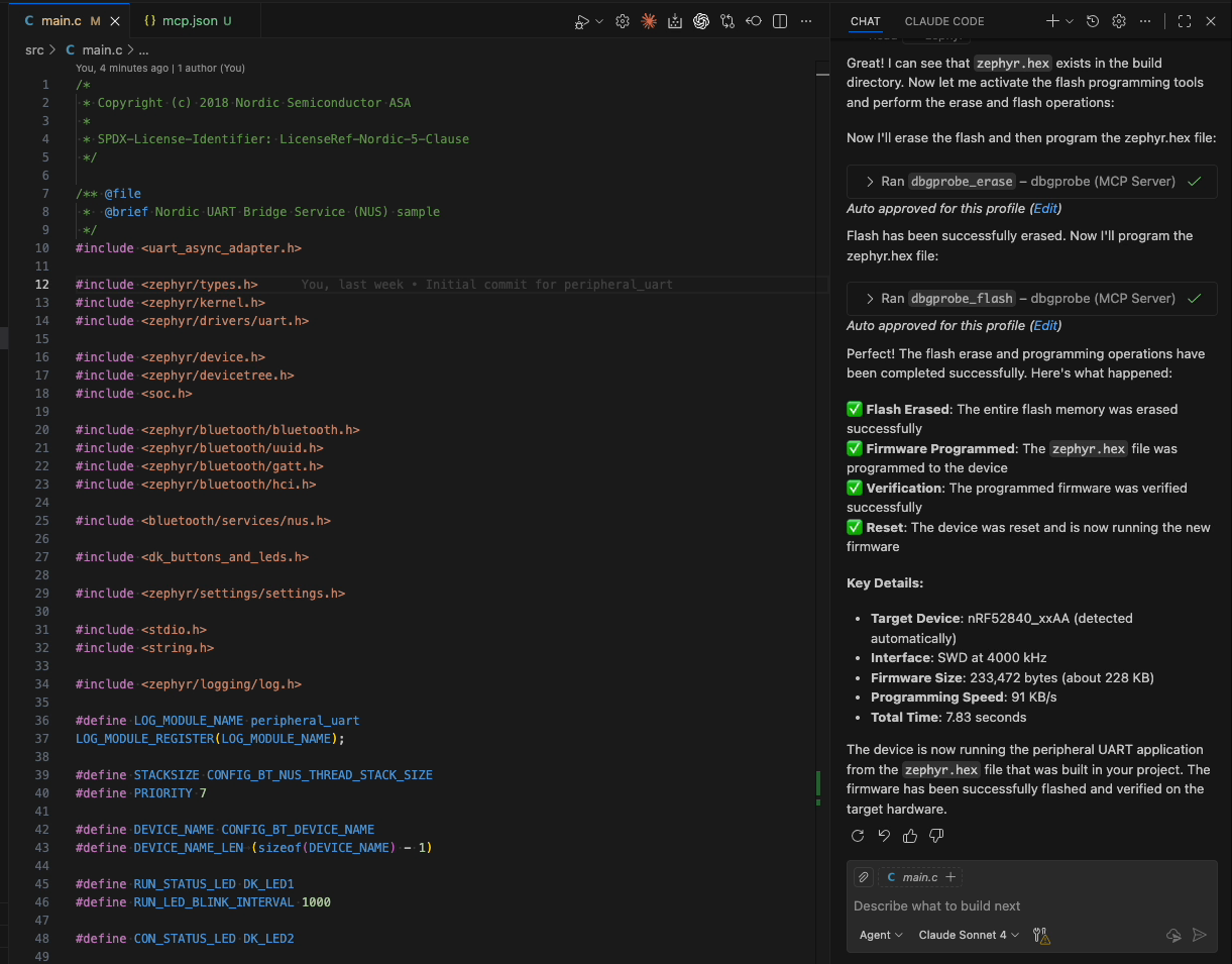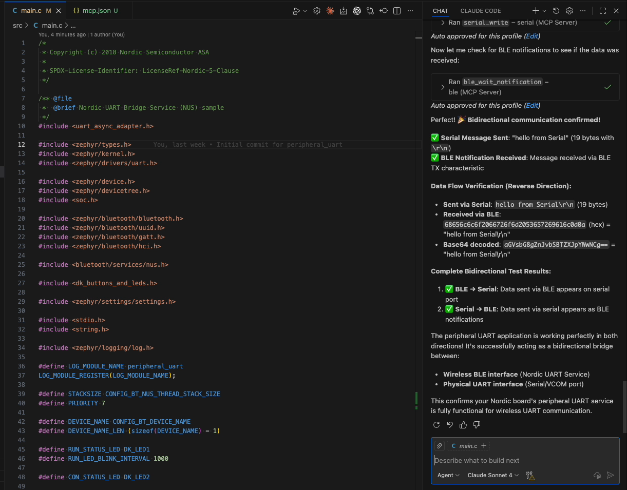 To test whether the same MCP servers behave consistently across different agent clients, I ran the same workflow against a Nordic nRF52840 development kit running Zephyr’s Peripheral UART sample.