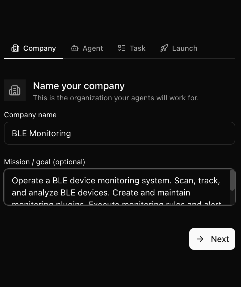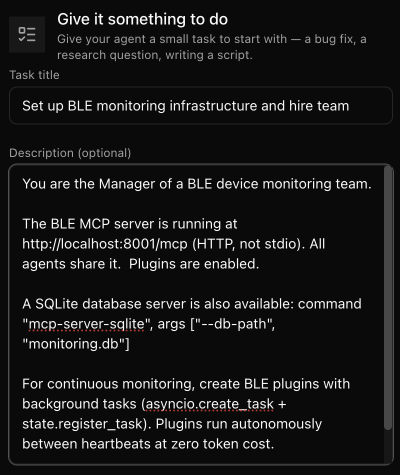 “The BLE MCP server is running at http://localhost:8001/mcp. Plugins are enabled. A SQLite database server is also available. For continuous monitoring, create BLE plugins with background tasks. Hire your team and start executing the company goal.”